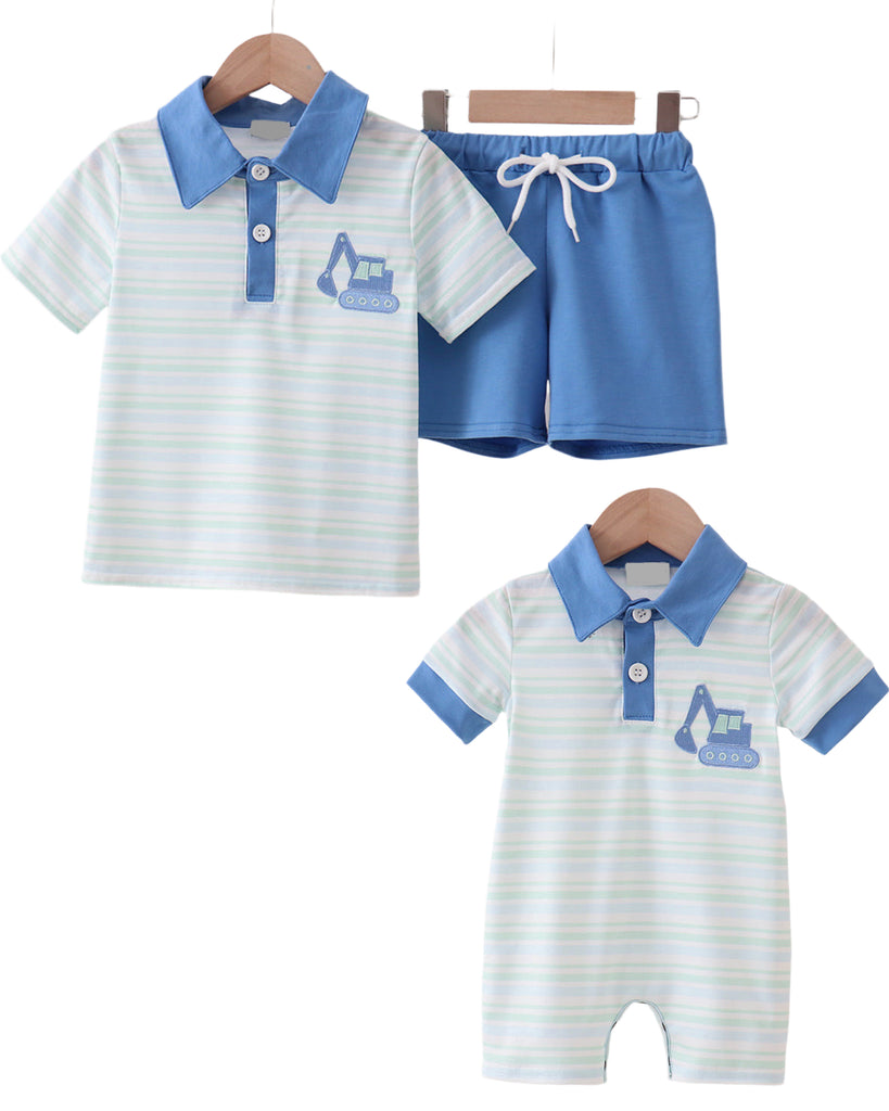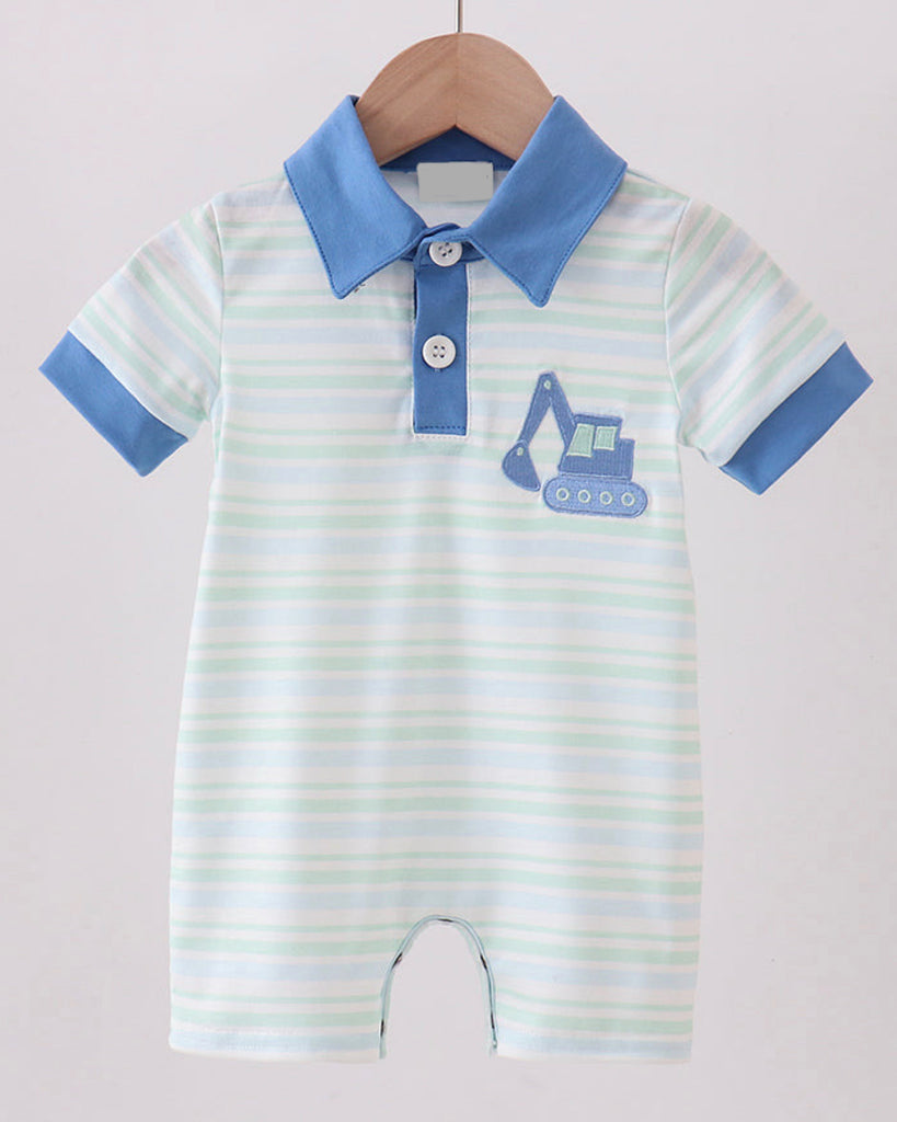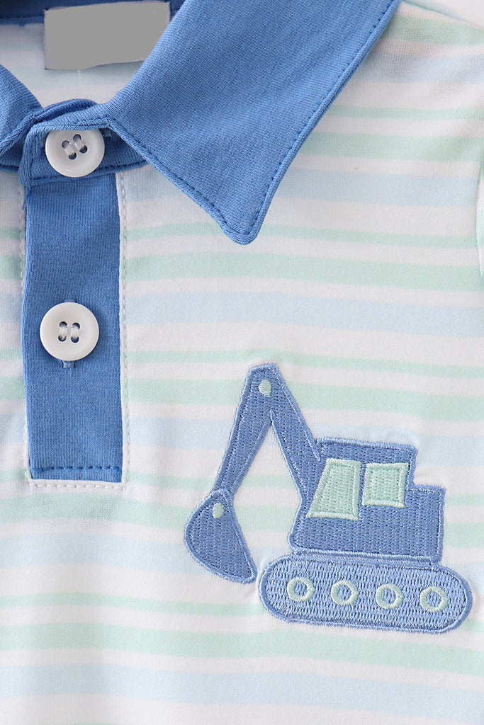 - features a charming blue stripe pattern paired with a fun excavator embroidery detail that'll have kids excited about playtime.