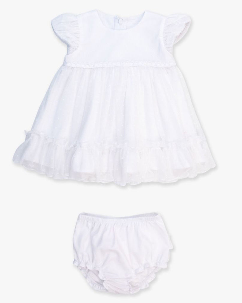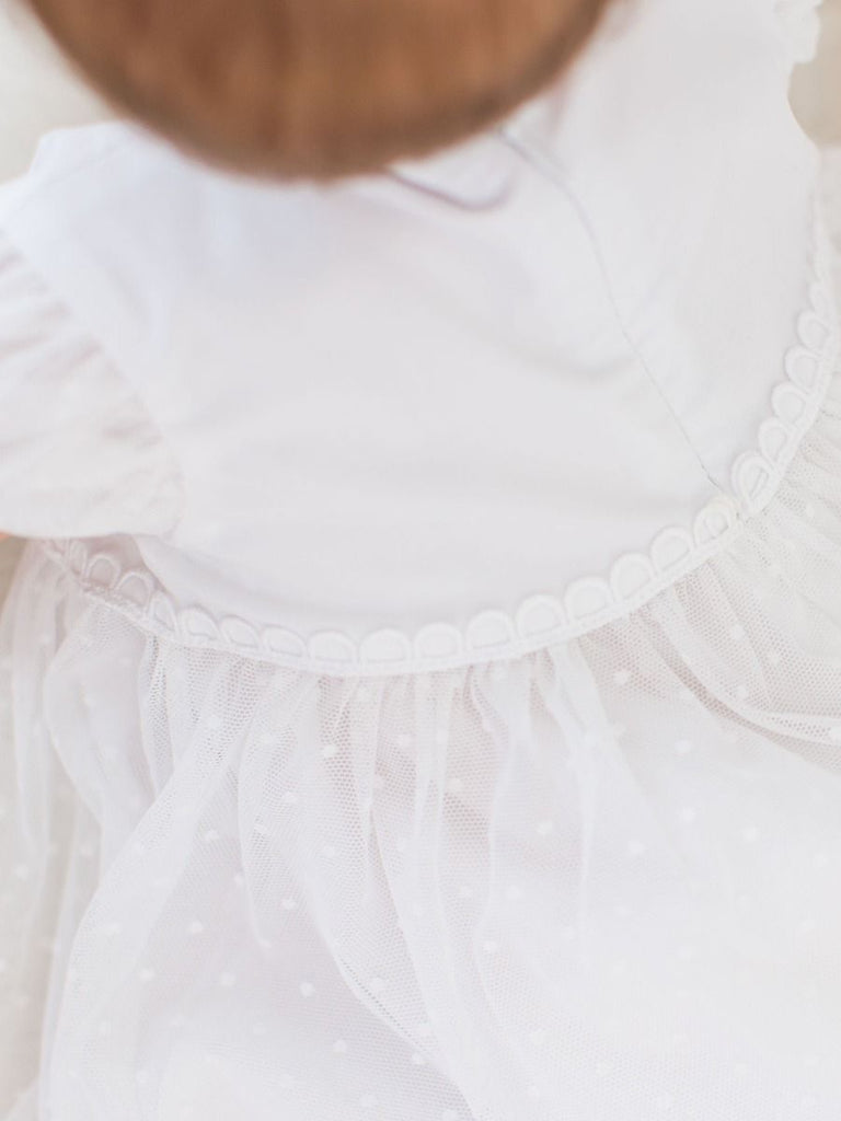 - featuring a gorgeous white tulle dress adorned with delicate dots and complemented by charming ruffle bloomers.